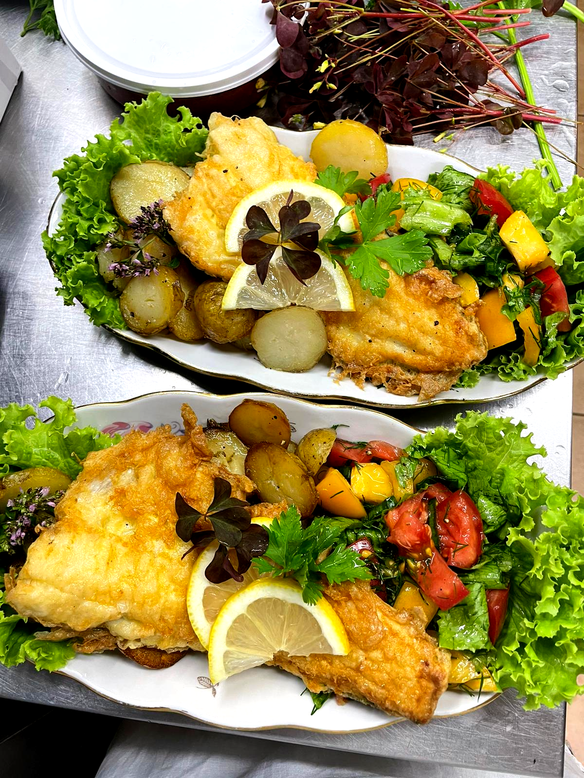- CEPT ZIVJ’ FILEJ’ AR RĀCEŅIEM UN ZALATIŅIEM - cepta zivs (kāds nu būs noķērts) ar rāceņiem, dažādiem zalatiņiem un zosti;