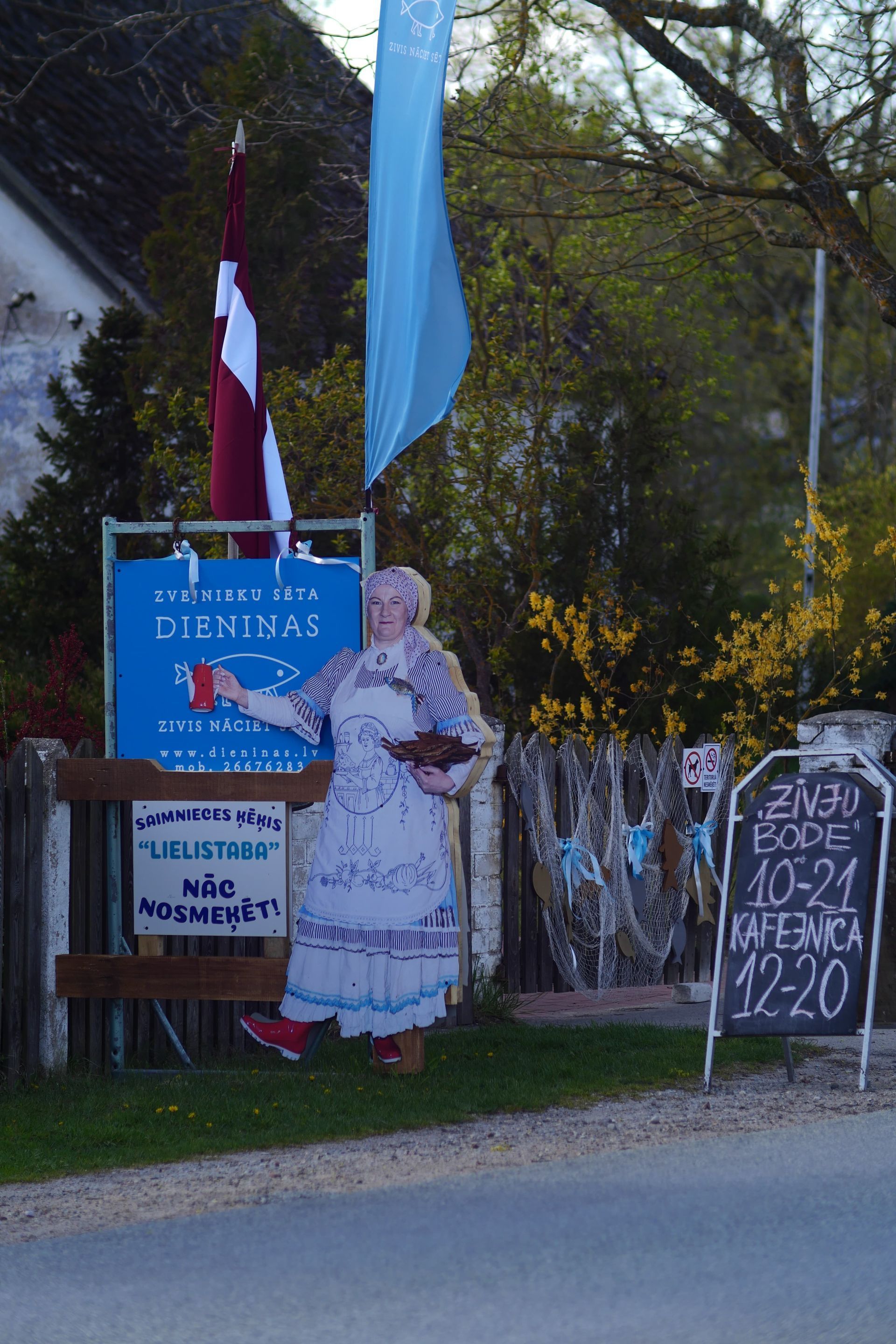 Ikvienu garāmbraucējs zvejnieku sētā aicina uzraksts "ZIVIS NĀCIET SĒTĀ"-